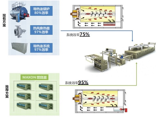 由于现有行业生产工艺中产品定型温度较高,利用蒸汽加热或导热油加热来定型产品,这样就难以取消导热油锅炉。根据现有企业的实际情况,通过采用天然气直燃热风技术,改变定型机原有由导热油间接换热方式,减少了能源在转换环节的损耗,可提高能源利用利率。